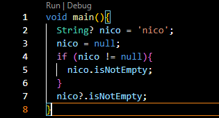 void main(){String? nico = 'nico';nico = null;if (nico != null){nico.isNotEmpty;}nico?.isNotEmpty;}값을 string 타입과 null을 동시에 받고 싶을 때